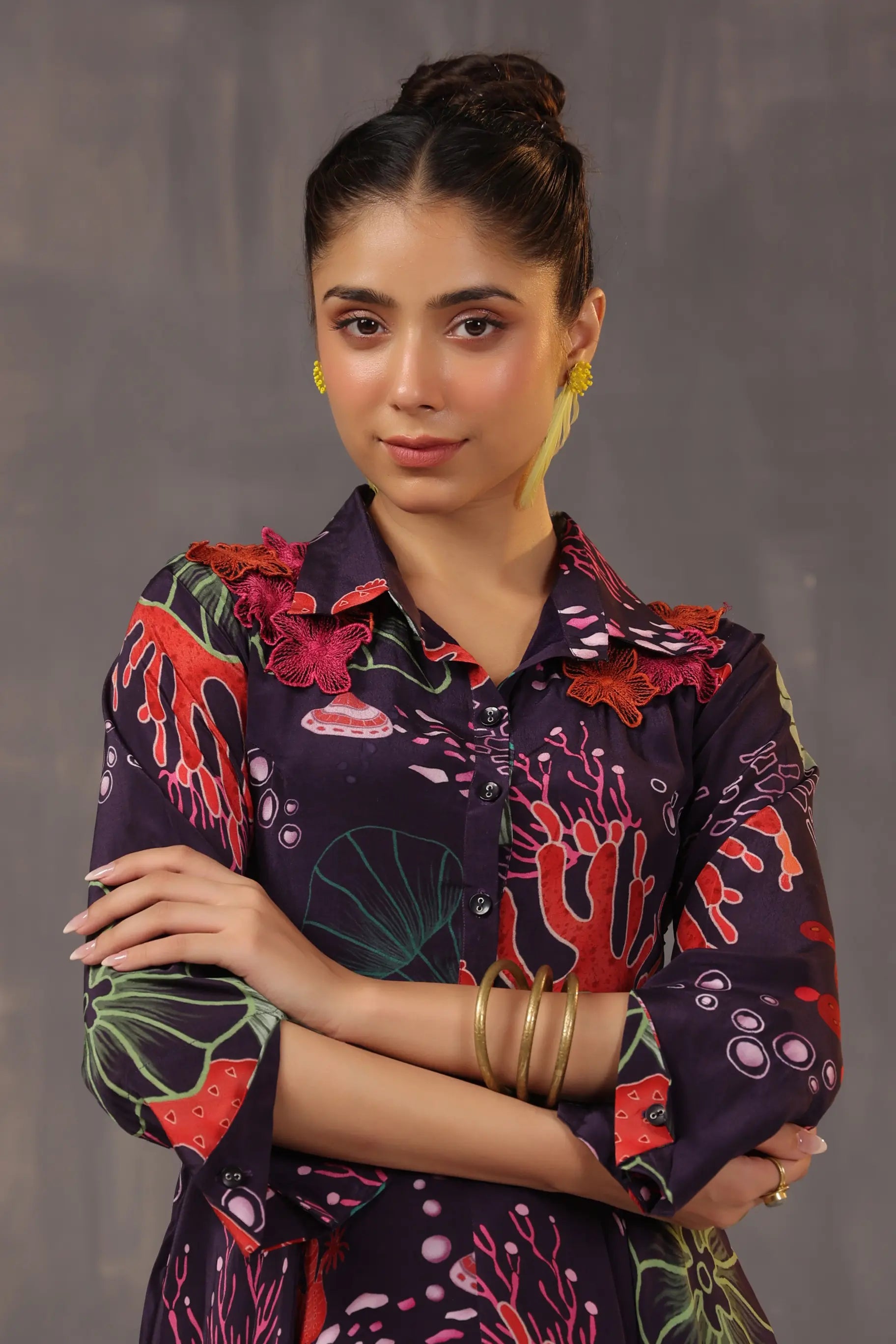 Aysymettrical Coral Dress with 3D Floral Yok Embellisehd