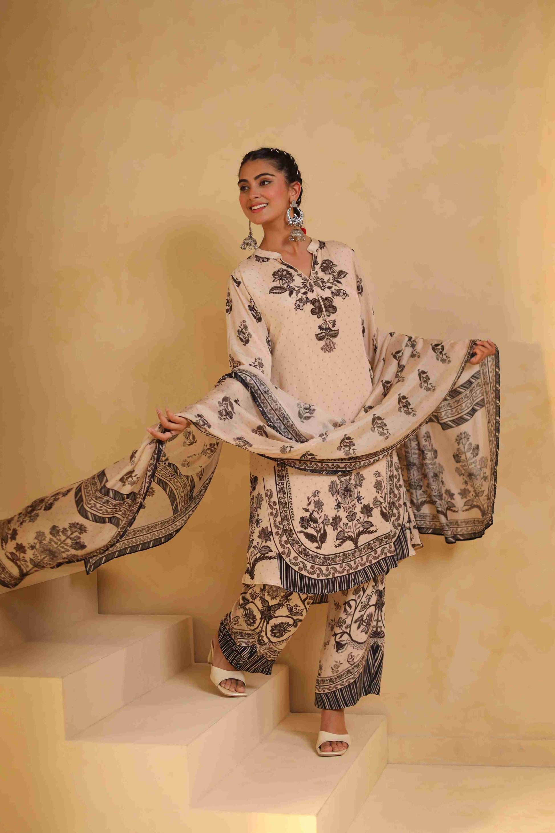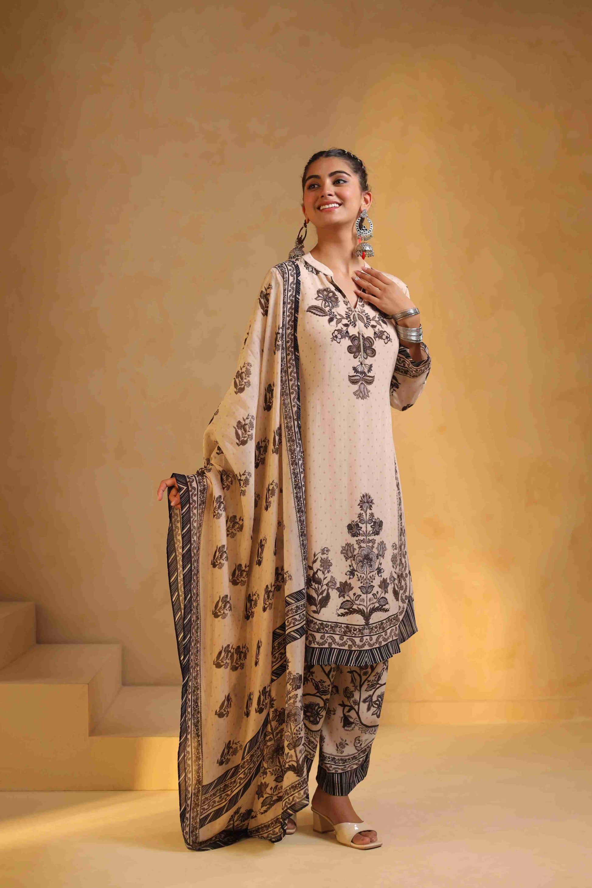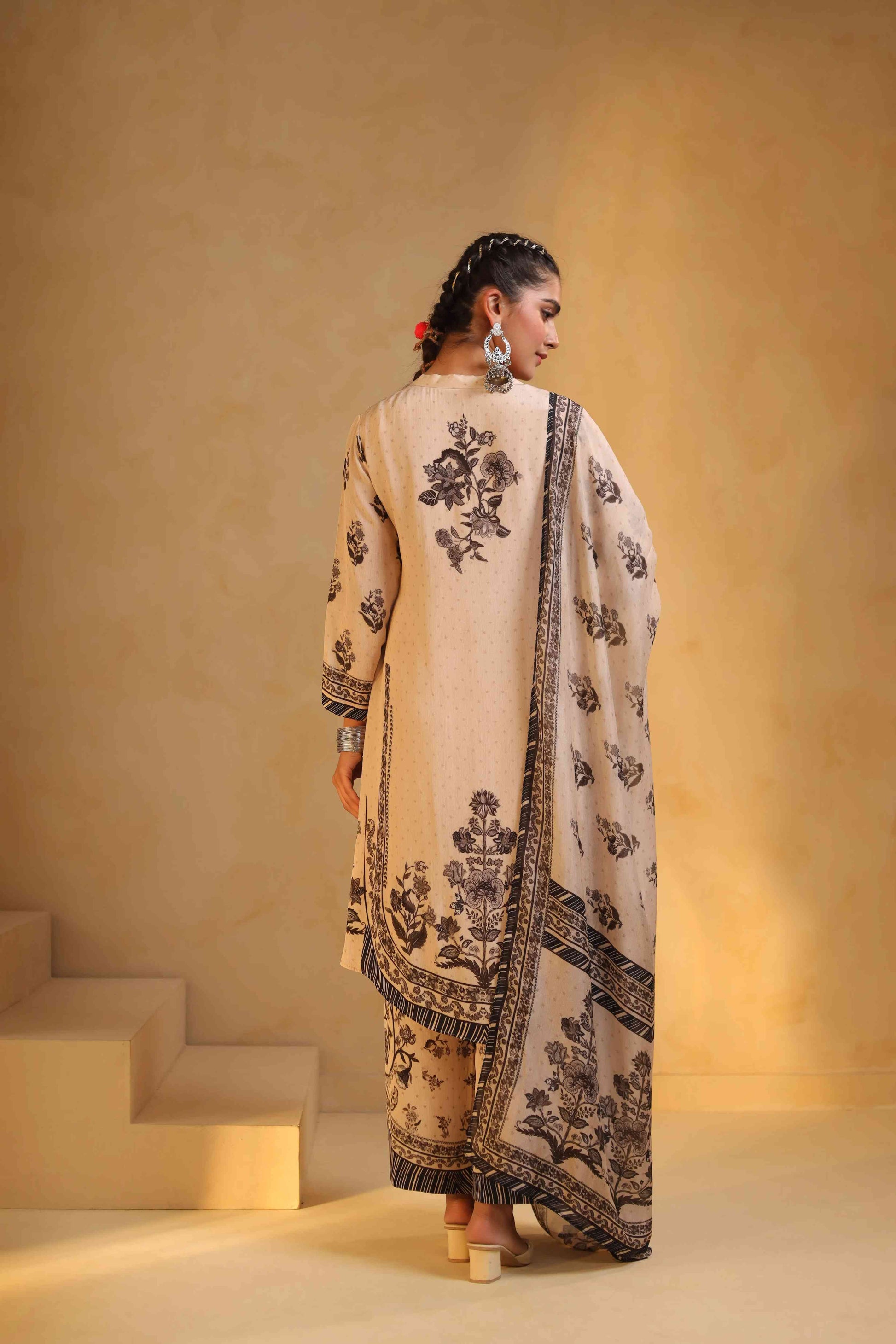 Material:– Top:- Viscose Crepe, Bottom:- Cotton Satin, Dupatta:- Paper Silk