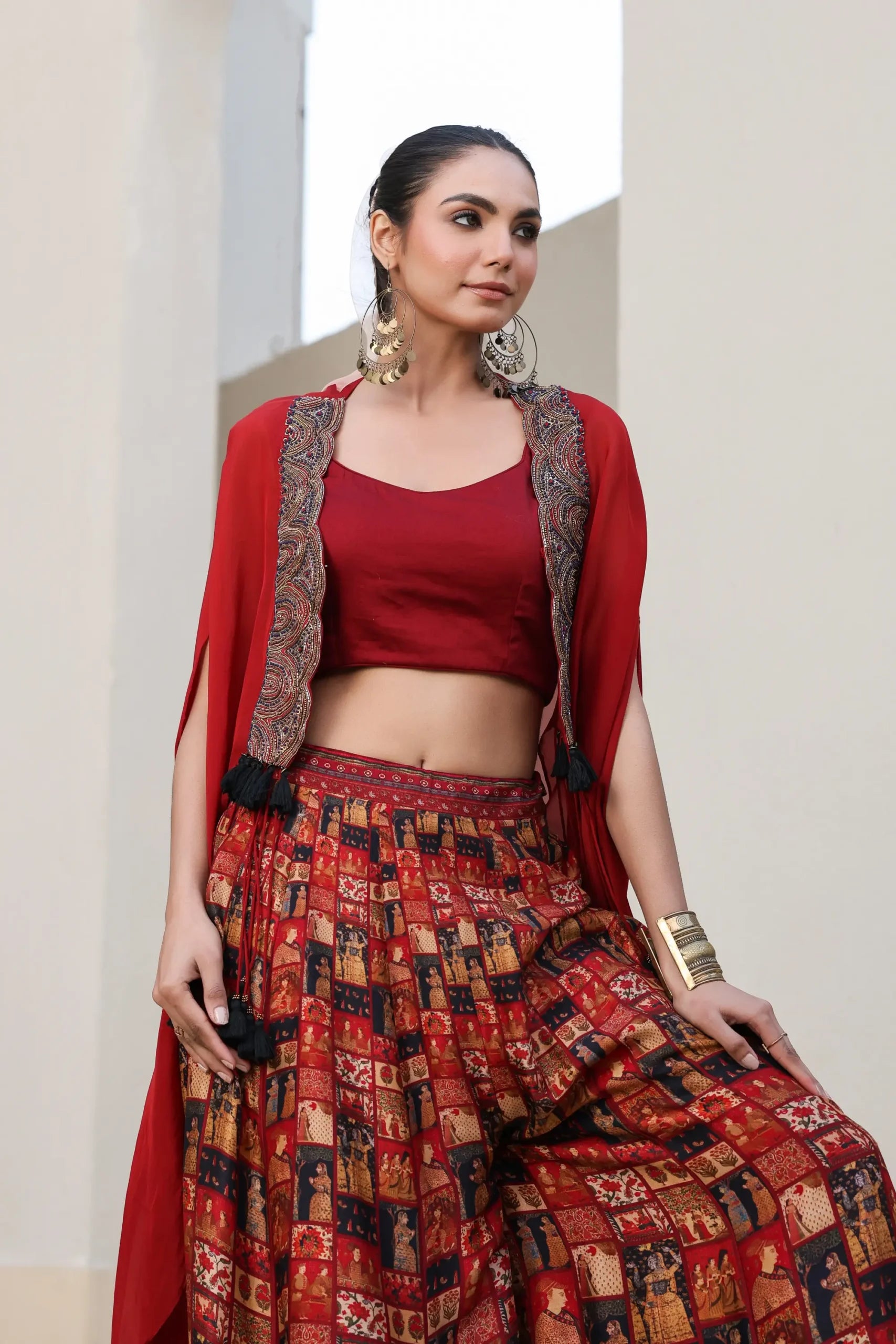 Mughal Art Printed Sharara with Heavy Embroidered Blouse And Solid Cape