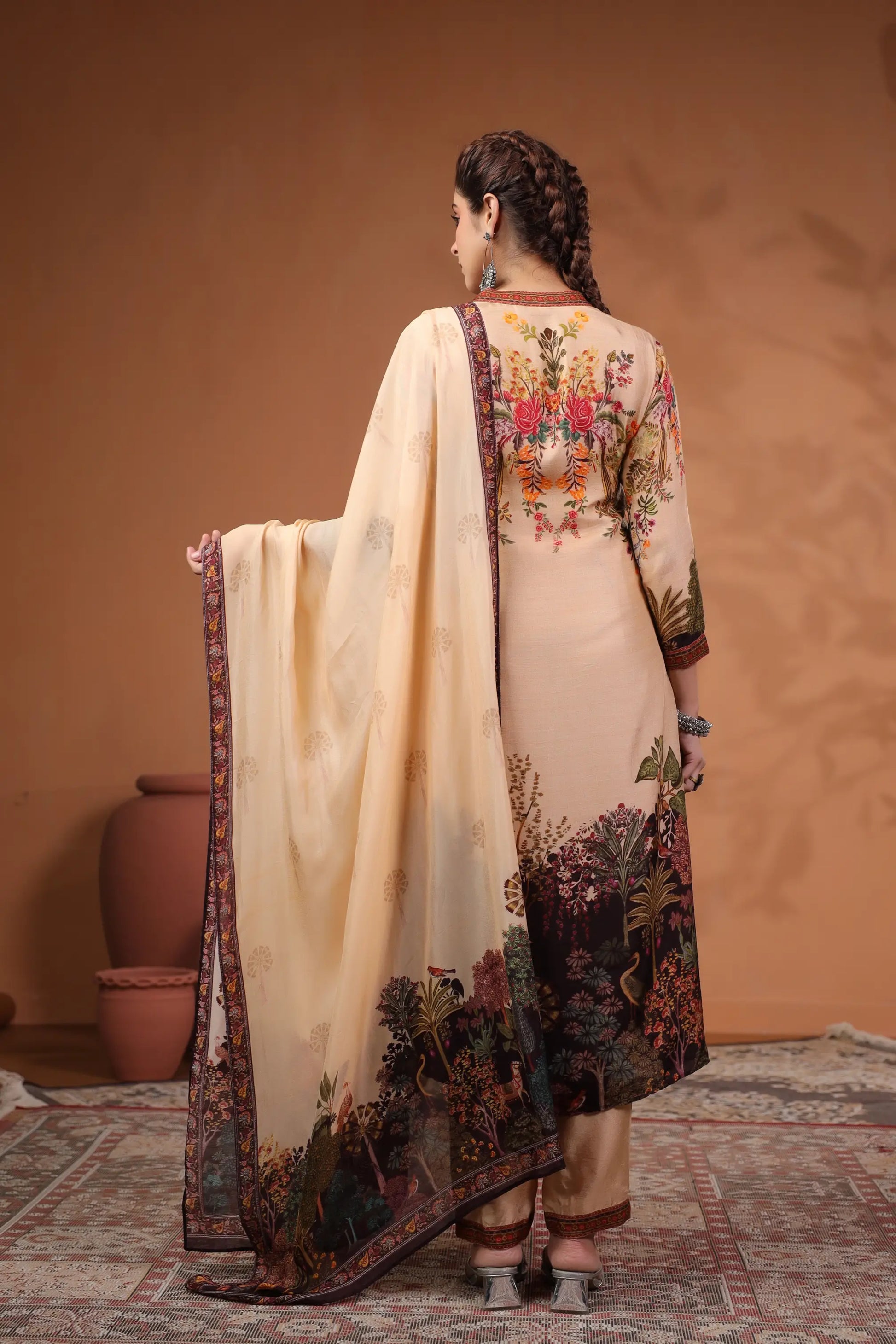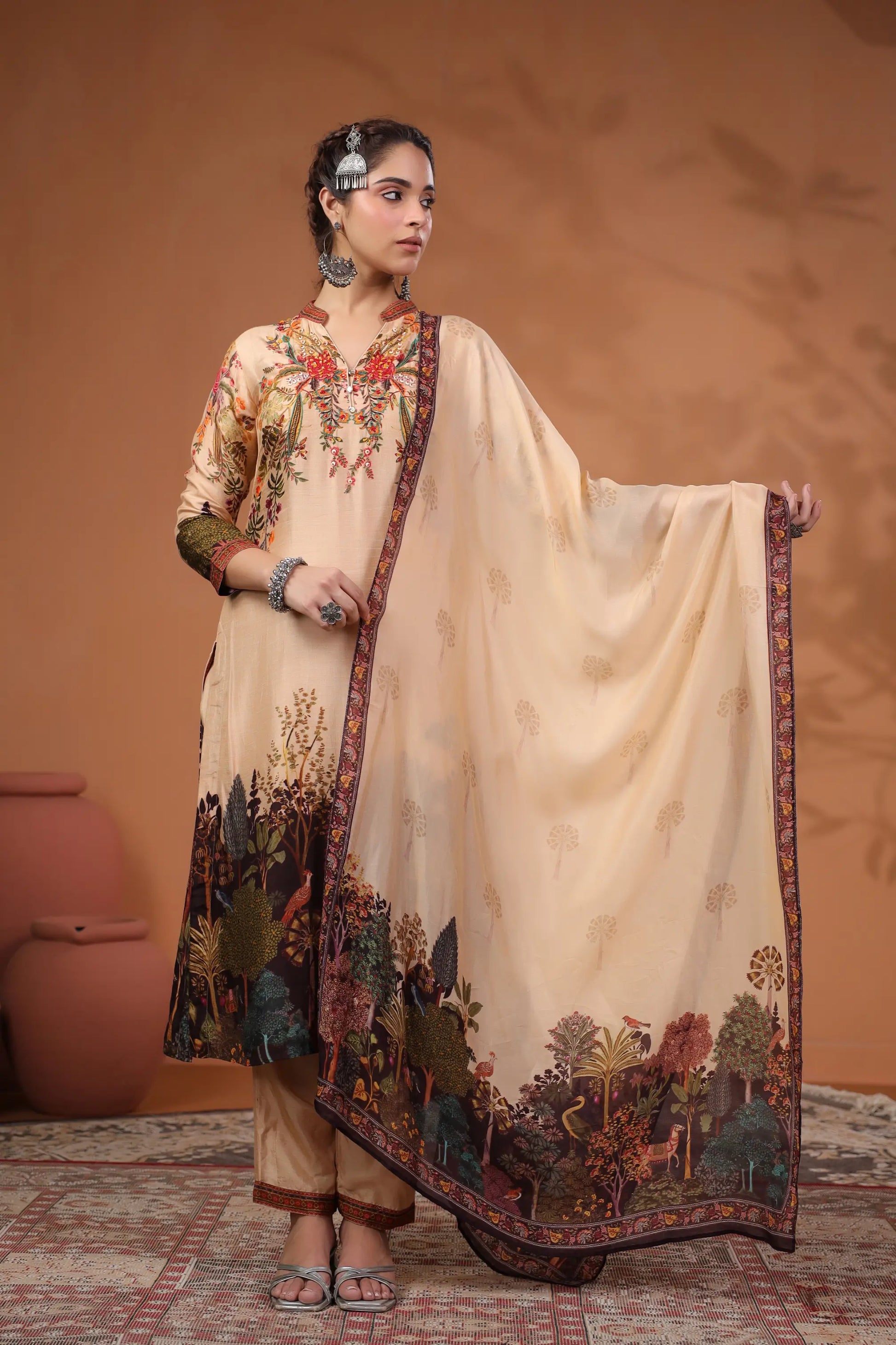 Oriental Print Straight Kurti with Pant and Printed Dupatta