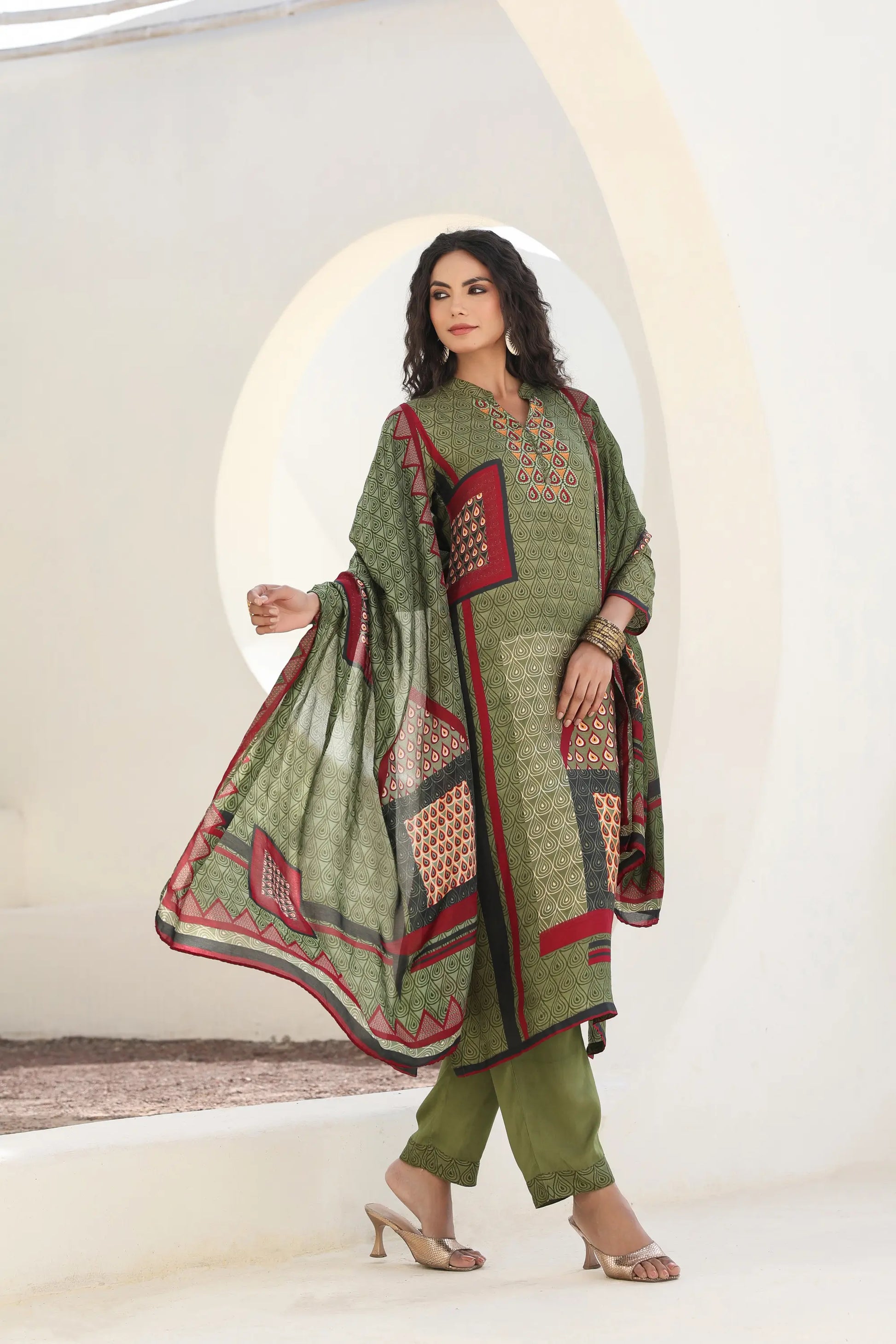 Traditional Print Straight Kurti with Pant and Printed Dupatta