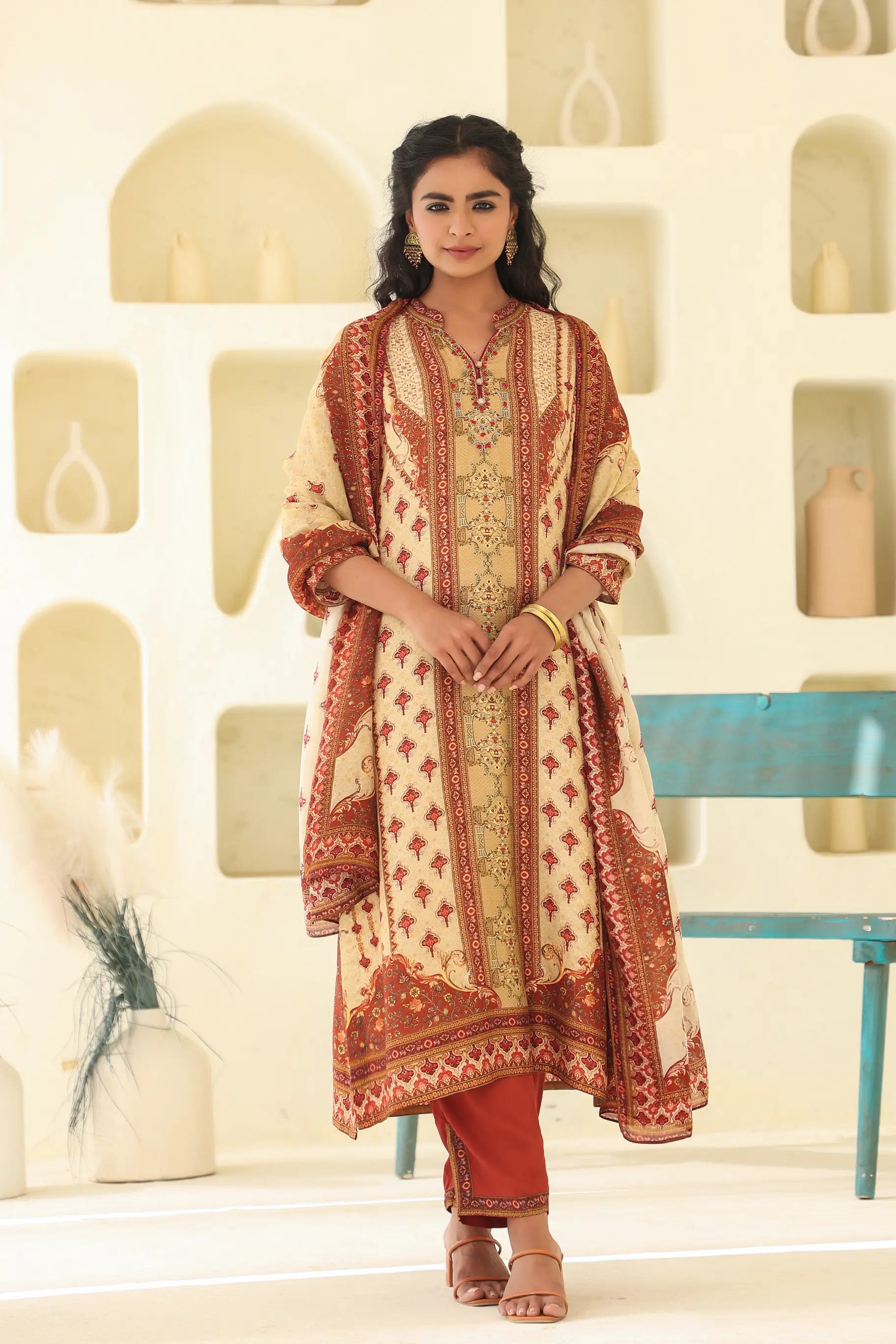 Traditional Print Straight Kurti with Pant and Printed Dupatta