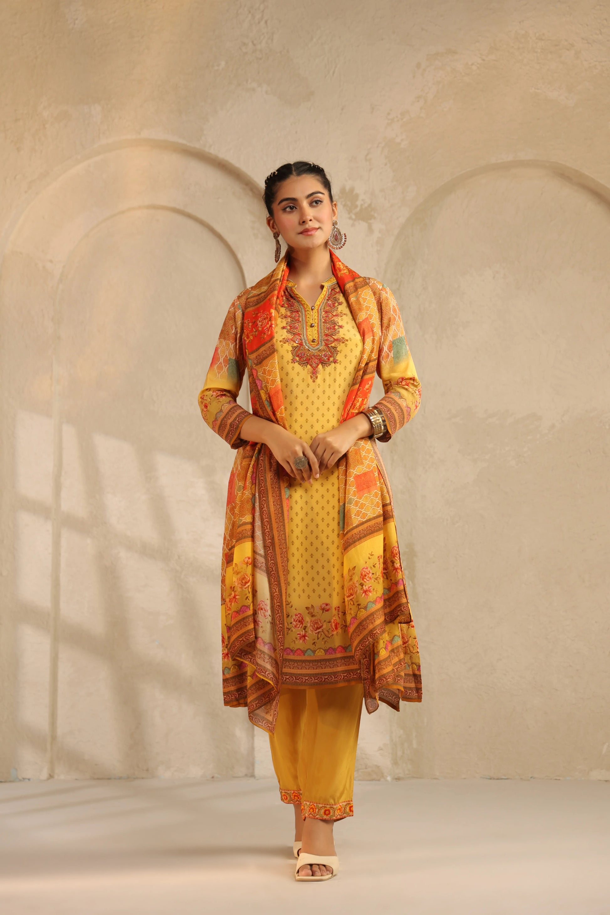 Material:– Top:- Viscose Crepe, Bottom:- Cotton Satin, Dupatta:- Paper Silk