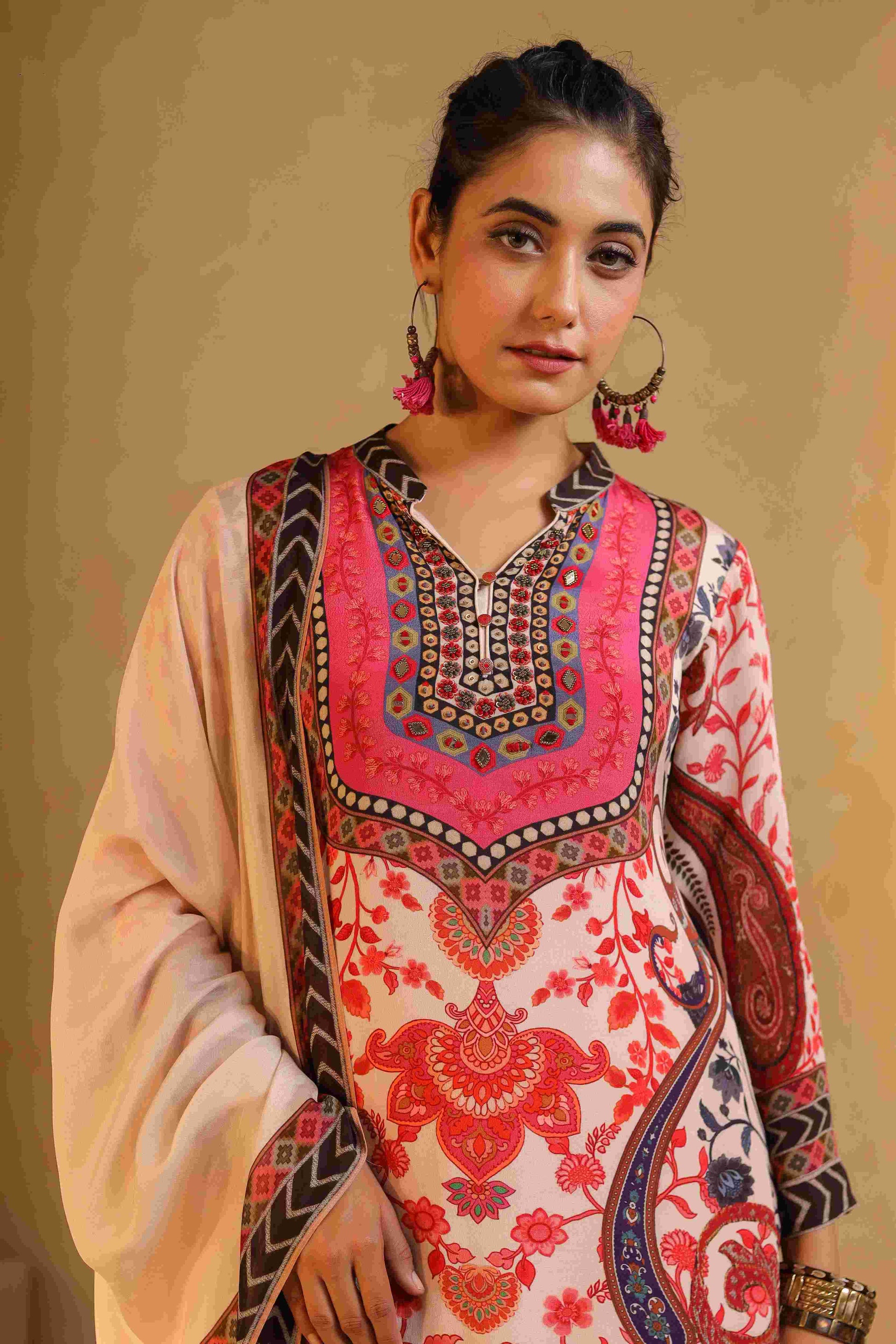 Material:– Top:- Viscose Crepe, Bottom:- Cotton Satin, Dupatta:- Paper Silk